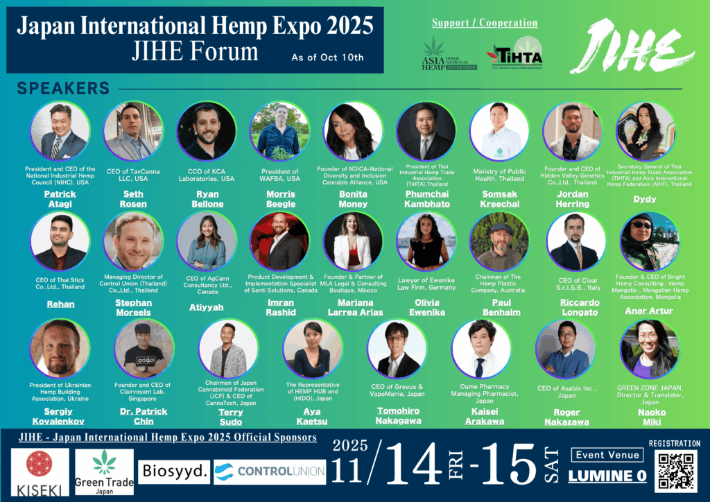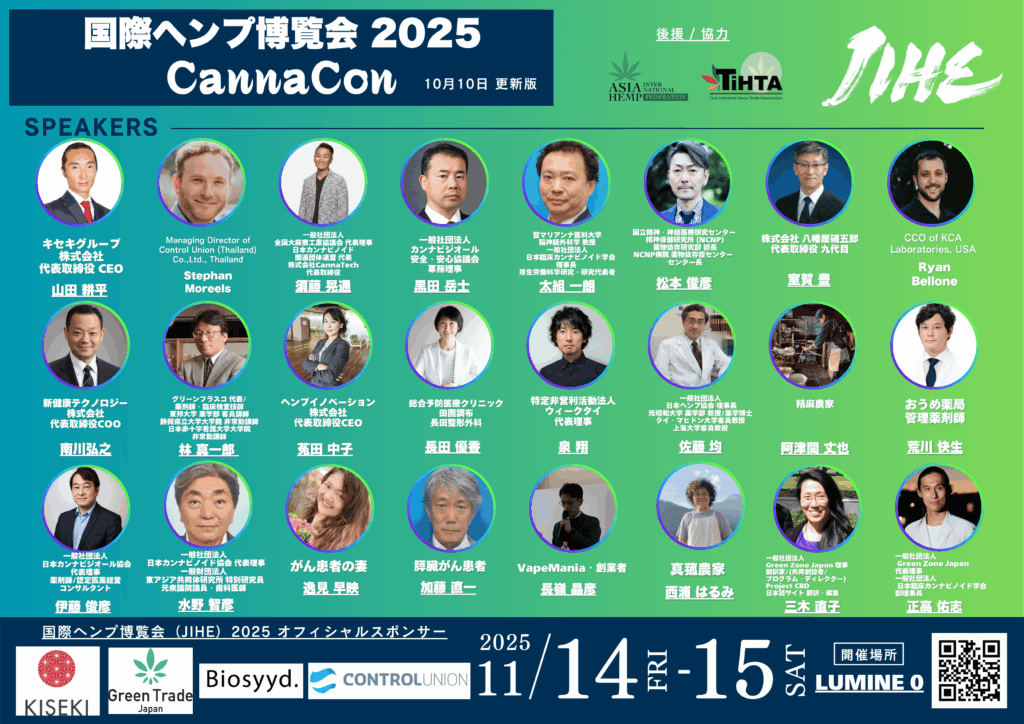 Asabis Inc. (สำนักงานใหญ่: เขตชิบุยะ กรุงโตเกียว ประธานบริษัท: Ryota Nakazawa) ร่วมกับ GREEN ZONE JAPAN (ประธาน: Yuji Masataka) จะจัดงานนิทรรศการและการประชุมระดับนานาชาติด้านอุตสาหกรรมกัญชง “Japan International Hemp Expo 2025 (JIHE 2025)” ขึ้น 2 วัน ในวันที่ 14–15 พฤศจิกายน 2025 ณ สถานที่จัดงาน LUMINE 0 ซึ่งเชื่อมตรงกับสถานีรถไฟ JR ชินจูกุ ถือเป็นงานระดับใหญ่ที่สุดของญี่ปุ่นในภาคอุตสาหกรรมนี้*