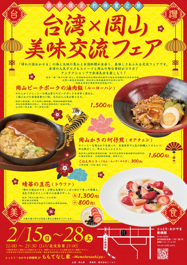 位於東京商業中心「新橋」,累計到館人數突破500萬人的「Tottori Okayama Shimbashi-kan」,其二樓餐廳「Bistro Café Momotenashiya」所舉辦的「台灣×岡山美味交流節」,已於日前圓滿落幕,現場盛況空前。(活動期間:2026年2月15日至2月28日)
