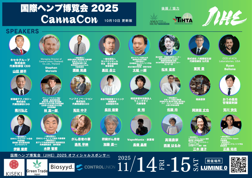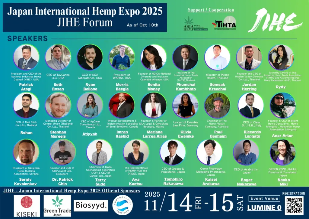Asabis Inc. (Headquarters: Shibuya, Tokyo / President & CEO: Ryota Nakazawa) and GREEN ZONE JAPAN (Representative Director: Yuji Masataka) have announced that the Japan International Hemp Expo 2025 (JIHE 2025) will be held at LUMINE 0 at Shinjuku station from November 14th to 15th, 2025. This is the largest* international hemp exhibition and conference in Japan.