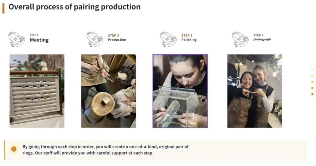 First-time ring-making in Japan, worry-free — clear guidance on process, what to bring, and duration encourages making rings while traveling.