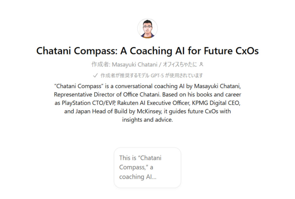 Office Chatani, Inc. has announced “Chatani Compass,” an interactive coaching AI tool that will answer questions related to the experiences and insights shared in works such as the “Recommendations to Future CxOs trilogy: A Compass for Leaders who Create the Future” and “Behind the Scenes of PlayStation,” by Masayuki Chatani, CEO of Office Chatani. The tool can be found at: https://c-compass-en.office-chatani.com.