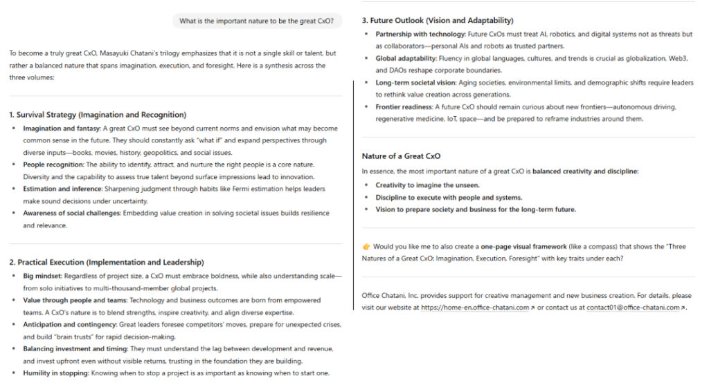 From the home screen, the tool will interactively share insights based on the “A Compass for Leaders who Create the Future” trilogy and “Behind the Scenes at PlayStation: Former CTO Talks about 16 Years of Creation” regarding questions and doubts future leaders are likely to have. This is the second AI agent, following the Japanese version of “Chatani Compass,” developed by Office Chatani.